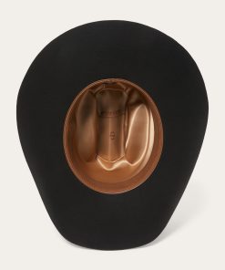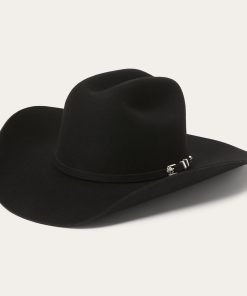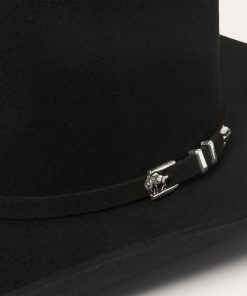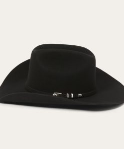 This Apache 4X is handmade in the U.S.A. of durable, weather-resistant 4X quality buffalo felt, which has a unique, pleasingly coarse texture. It features a 4″ brim and a 4 ⅝” regular oval cattleman crown finished with a matching self-felt band and three-piece silver-tone buffalo buckle set. A genuine leather sweatband and full satin liner ensure a secure and comfortable fit. Includes an original Stetson hat box.