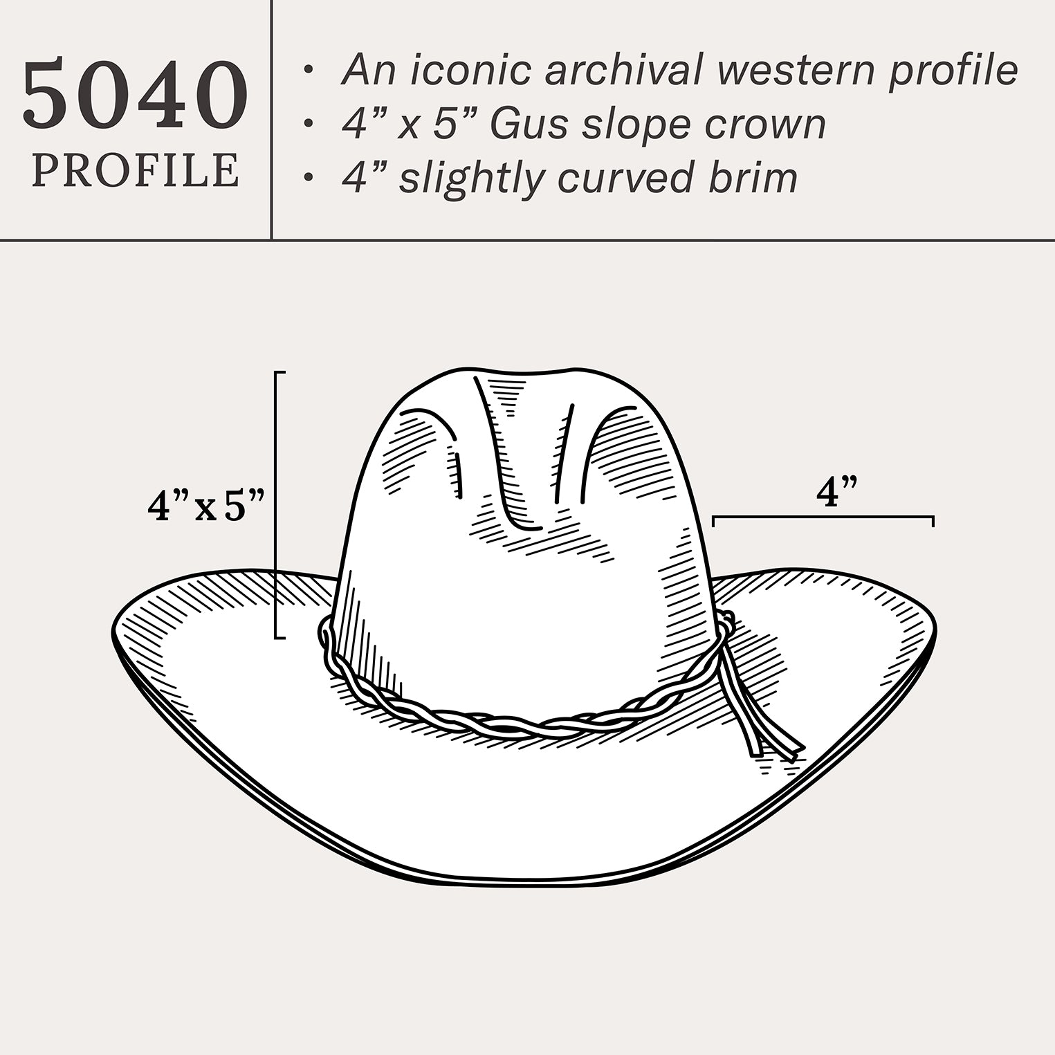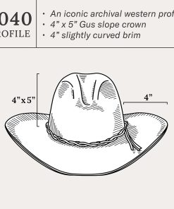 A true Stetson icon, the Gus combines legendary quality and a classic profile that recalls the earliest days of western hats. The Gus is crafted from our proprietary 6X fur felt, which is prized for its durability and elegant feel, and, as with all hats that come out of our factory in Texas, each Gus is touched by more than 100 sets of hands during production, resulting in a hat that is designed and built to stand the test of time. It features a 4” x 5” medium slope crown and 4” slightly curved brim. Each Gus is finished with a twisted leather band and a branding-iron hat pin bearing the initials “JBS”, a nod to our founder, John B. Stetson, whose pioneering legacy lives on in every hat we make. A handsewn genuine leather sweatband and full satin liner provide a time-tested fit and premium comfort.