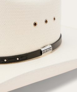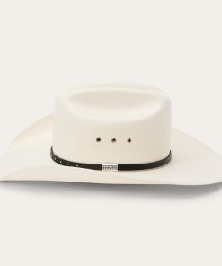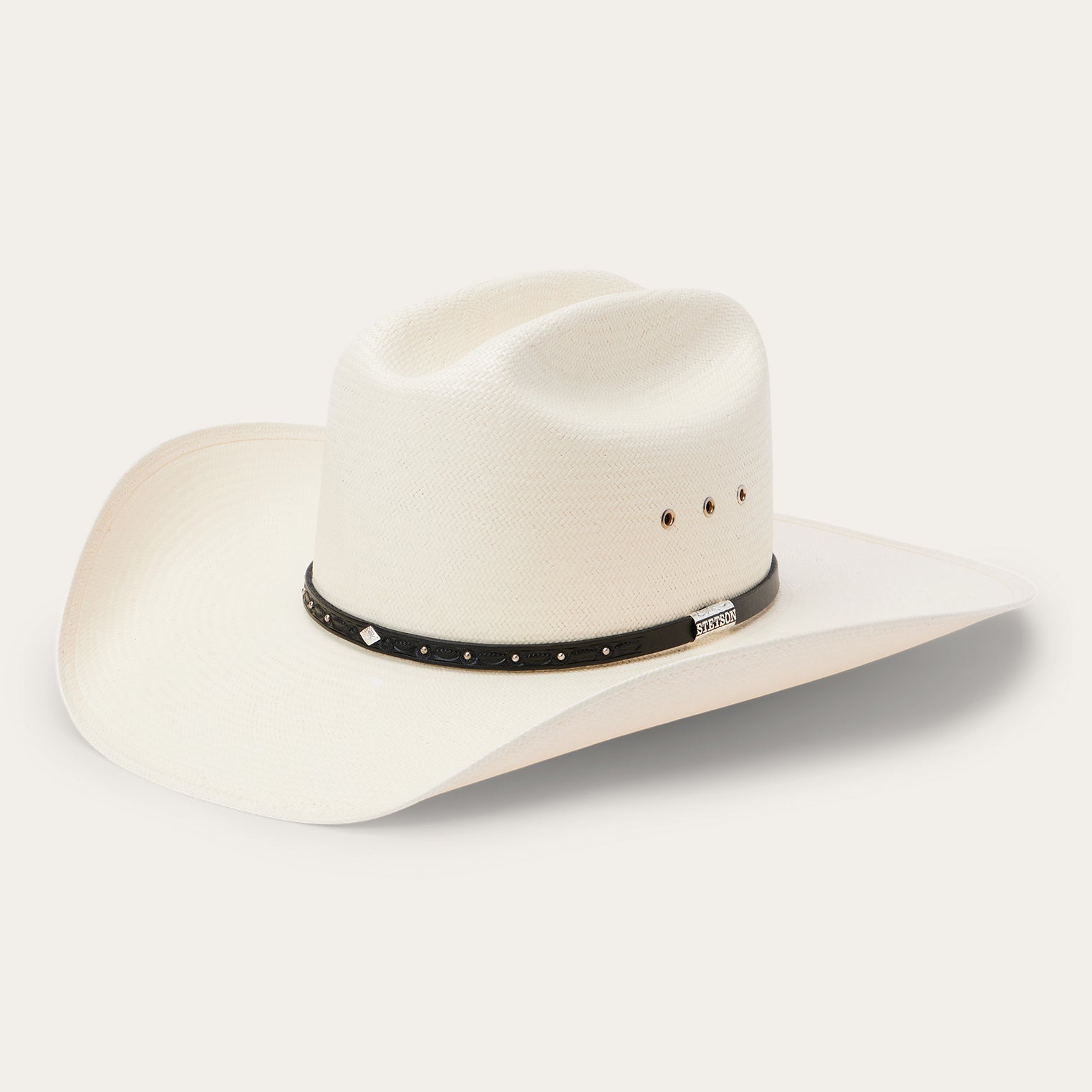 Handmade in the USA, the Hagerman 10X Straw Cowboy Hat has a 4 1//4” brim and a 4 1/8” regular oval crown with cattleman’s crease and eyelets for increased circulation and breathability. A studded leather hat band featuring silver-toned, diamond-shaped conchos enhances its rugged Western style and a genuine leather sweatband ensures premium comfort all day long.
