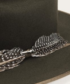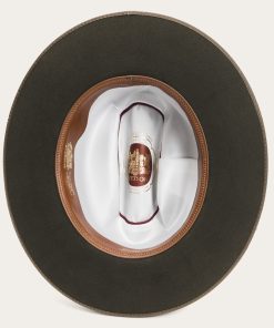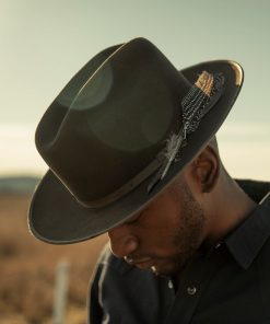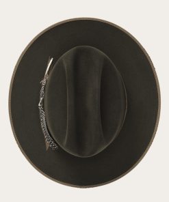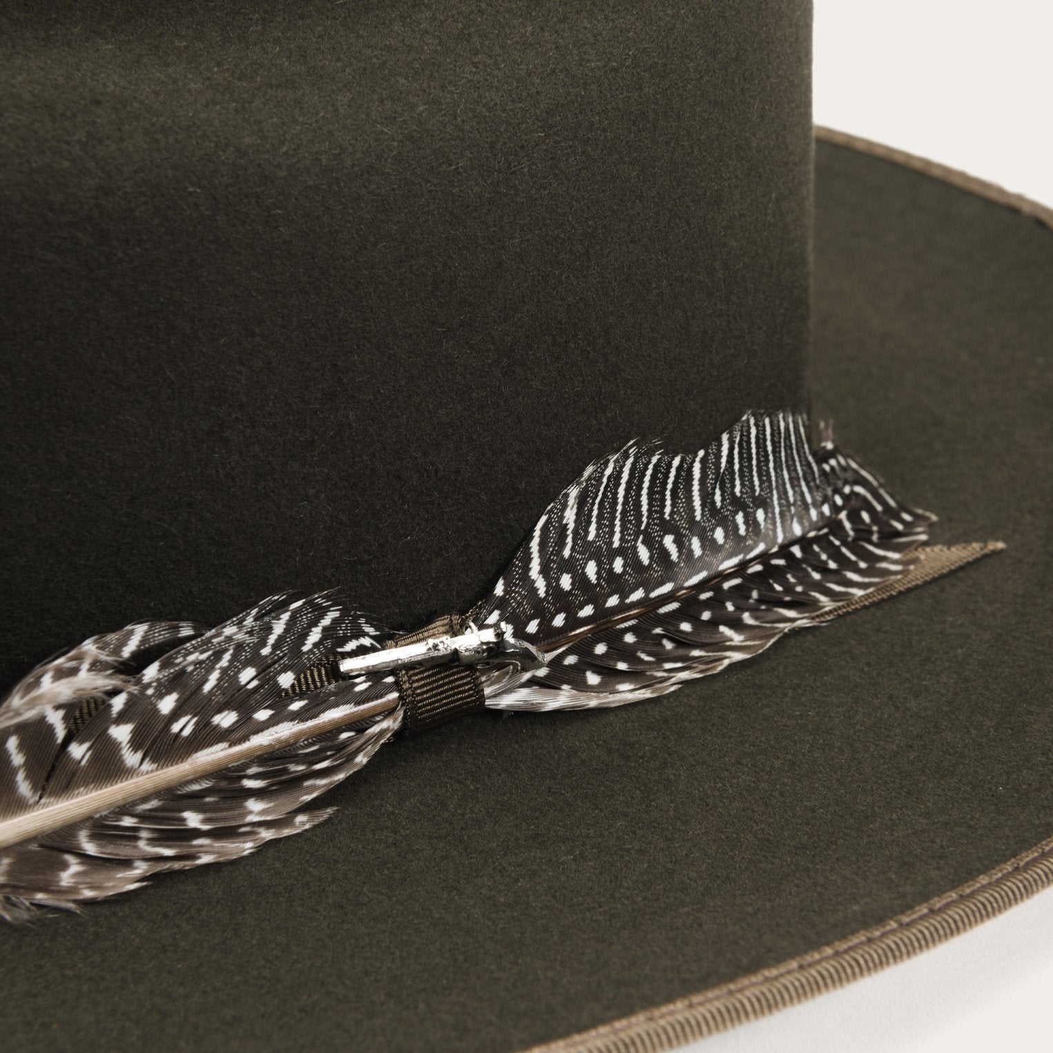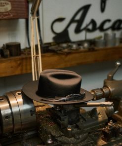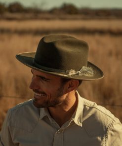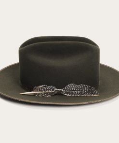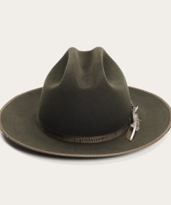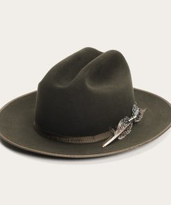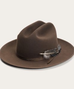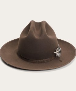 The 1865 Distressed Open Road Royal Deluxe features a genuine leather sweatband and a 4 ¼” crown outfitted with a grosgrain hat band, an eye-catching feather detail and a hat pin honors Stetson’s Western heritage—and a nod to the pioneering spirit that lives on in every hat we sell.