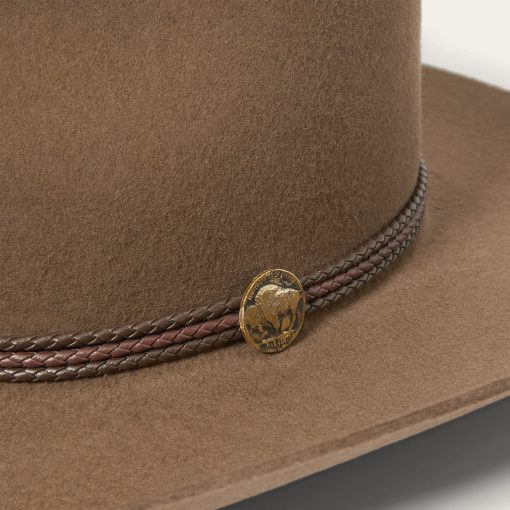 Handmade with pride in Texas, the Woodrow is a statement-making style crafted with a firm finish from high-quality 100% wool felt. It has a 4 1/2” pinch front crown, 3 1/4” brim and a three-cord braided leather hatband and Buffalo nickel pin. A full satin liner provides luxurious comfort and while an absorbent DRI-LEX® sweatband provides a cooling, secure fit.