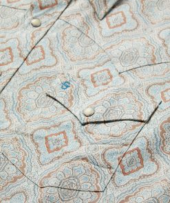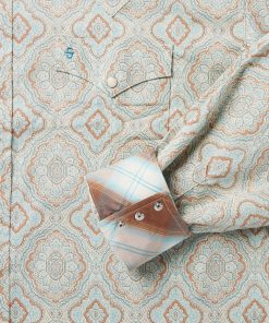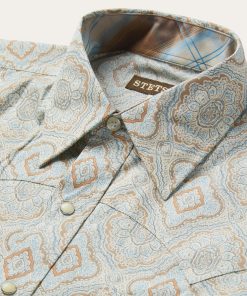 This Western shirt is crafted from a lightweight cotton poplin with a rich Aqua paisley print. It features a one-point curved back yoke, classic snap front featuring opaque logo snaps, and three snap cuffs. The front left pocket is adorned with the Stetson “S” logo and the right sleeve placket is embossed with “STETSON”. It has a contrast inside trim and is crafted with 100% cotton for quality, breathability and comfort.