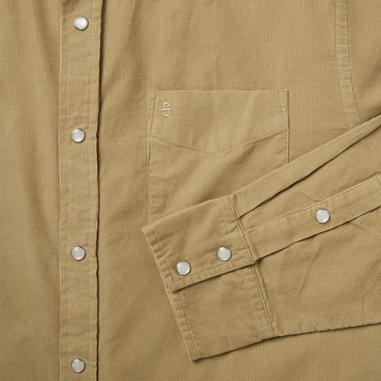 This stylish western shirt is crafted from 100% cotton baby corduroy, which is known for its soft texture and rugged durability. It has no front yokes, a shallow straight back yoke with pleat, one open pocket, subtle Stetson embroidery on the chest and right cuff placket, a classic snap front with pearl logo snaps and one-snap cuffs. Cut in our standard fit for a traditional silhouette that allows for freedom of movement.