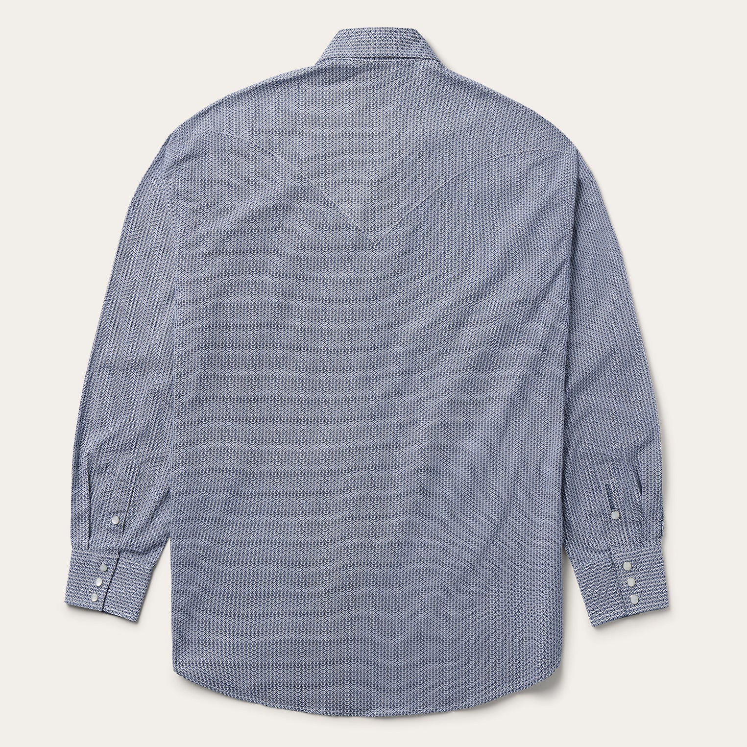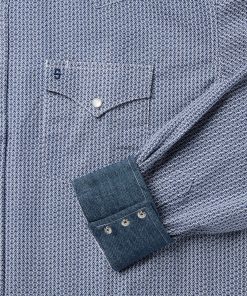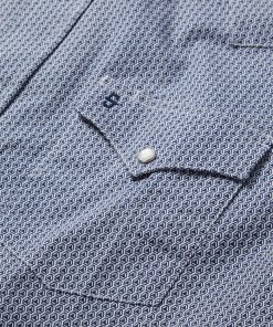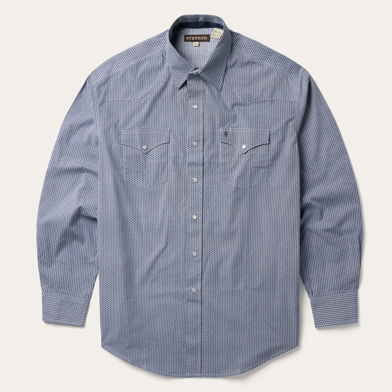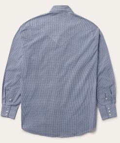 This Western shirt is crafted from a lightweight cotton poplin with a Blue Deco Geo allover print. It features a one-point curved back yoke, snap front featuring logo pearl snaps, and three snap cuffs. The front left pocket is adorned with the Stetson “S” logo and the right sleeve placket is embossed with “STETSON”. It has a denim inside trim and is crafted with 100% cotton for quality, breathability and a feel that will only get better with age.