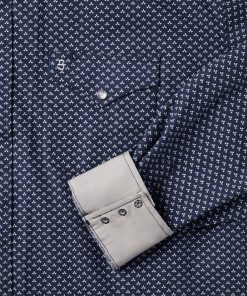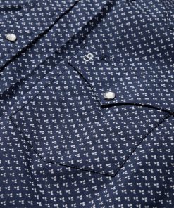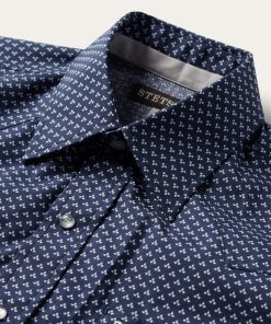 Woven from crisp cotton poplin, this snap front Western shirt features our allover Polaris Geo print in a rich blue color. It has a one-point, ultra-deep, curved back yoke, pearl logo snaps. contrasting khaki poplin inside trim, the Stetson “S” embossed on the front left pocket, and STETSON embossed on the right sleeve placket.