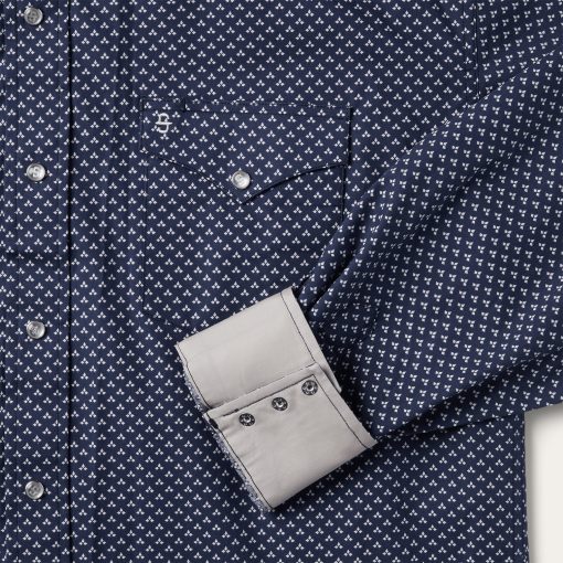 Woven from crisp cotton poplin, this snap front Western shirt features our allover Polaris Geo print in a rich blue color. It has a one-point, ultra-deep, curved back yoke, pearl logo snaps. contrasting khaki poplin inside trim, the Stetson “S” embossed on the front left pocket, and STETSON embossed on the right sleeve placket.