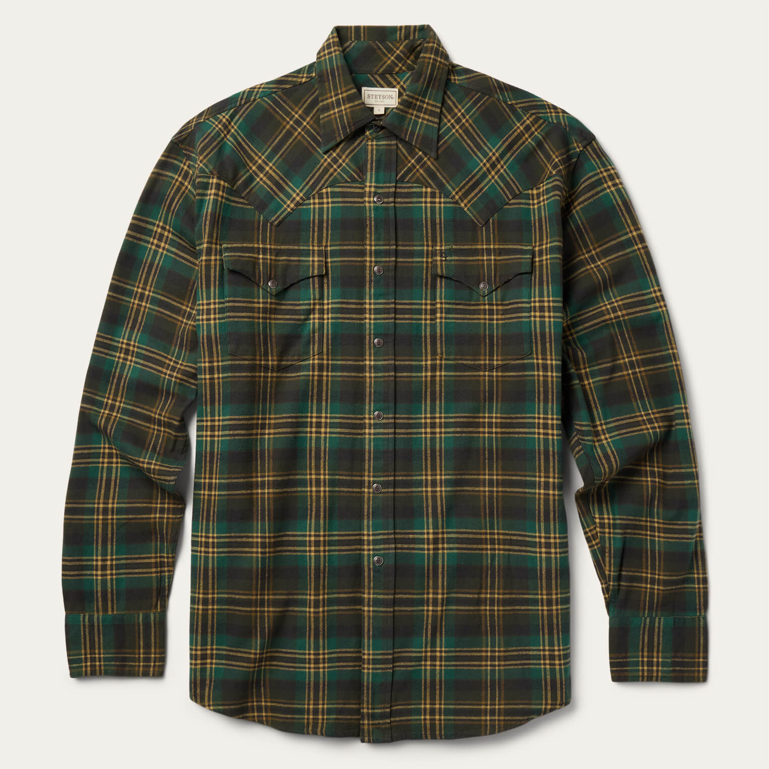 This flannel western shirt is crafted from high-quality brushed cotton twill that’s been garment washed for a soft feel that will only improve over time. Its authentic details include a single-point curved back yoke, a spread collar with collar stays, subtle Stetson embroidery on the chest and right cuff placket, a classic snap front and three-snap cuffs. Cut in our original fit for a traditional silhouette that allows for freedom of movement.