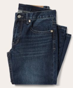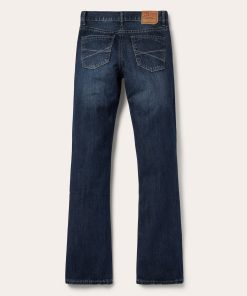 These 1014 Rocker Fit jeans are crafted from 100% cotton denim with a dark blue rinse. Featuring a low rise and slightly fitted thigh, the bootcut leg opening creates a modern silhouette. The classic 5-pocket style features a single X deco on the back pocket, as well as Stetson branded buttons, rivets, and zipper. Finishing touches, like hand sanding and whisker detail, complete the jeans for that perfect lived-on-the-road look.