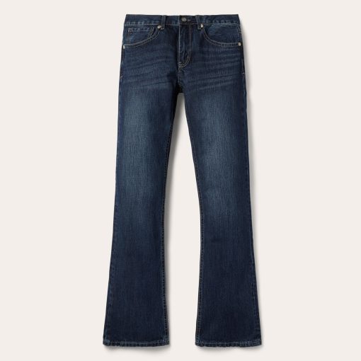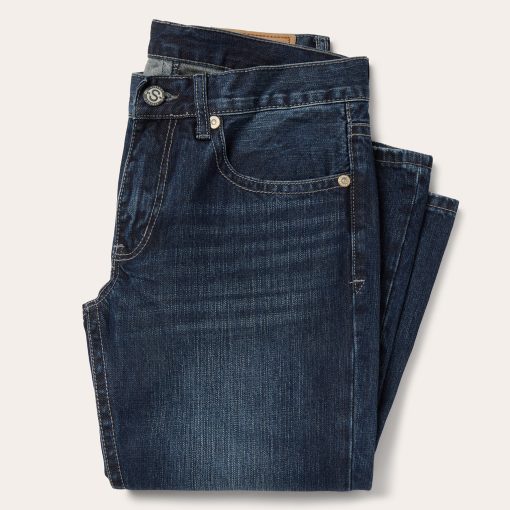These 1014 Rocker Fit jeans are crafted from 100% cotton denim with a dark blue rinse. Featuring a low rise and slightly fitted thigh, the bootcut leg opening creates a modern silhouette. The classic 5-pocket style features a single X deco on the back pocket, as well as Stetson branded buttons, rivets, and zipper. Finishing touches, like hand sanding and whisker detail, complete the jeans for that perfect lived-on-the-road look.