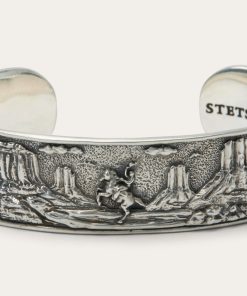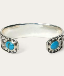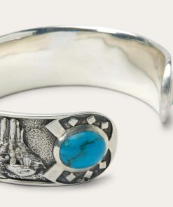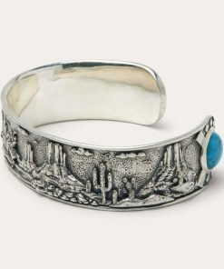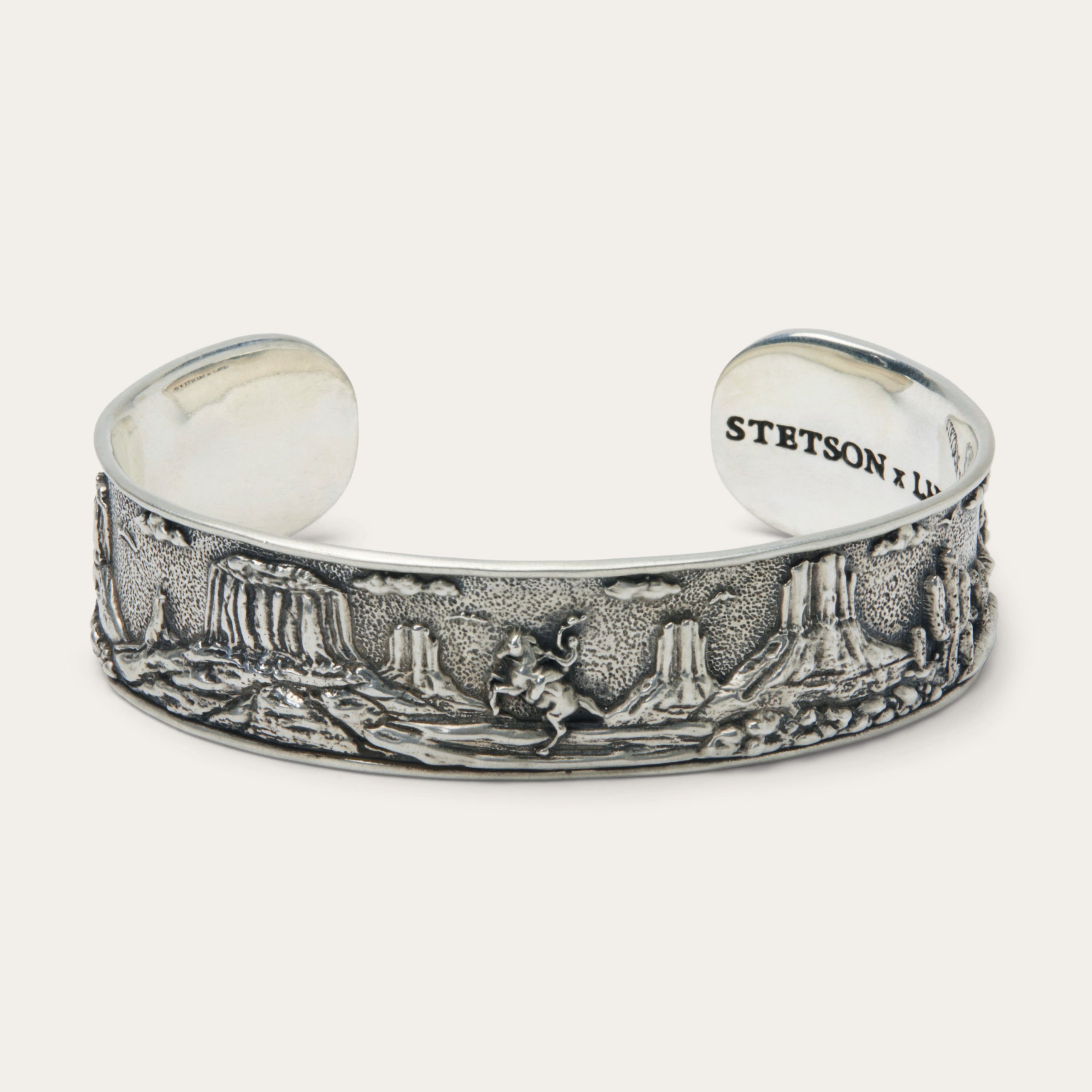 The rugged beauty and adventurous spirit of the American West is captured in this ornate sterling silver cuff, which presents a panoramic landscape inspired by Monument Valley. A lone cowboy rearing on his horse, hat held high, is depicted in celebration of the great surroundings. Striking Turquoise gemstones sit in horseshoe settings at either end of the cuff, bookending the sprawling, majestic image. Whether worn on its own, or layered with other accessories, it offers a timeless, Americana-inspired look.