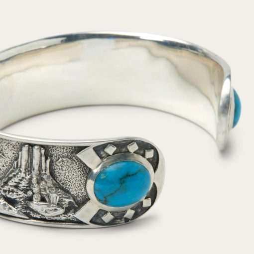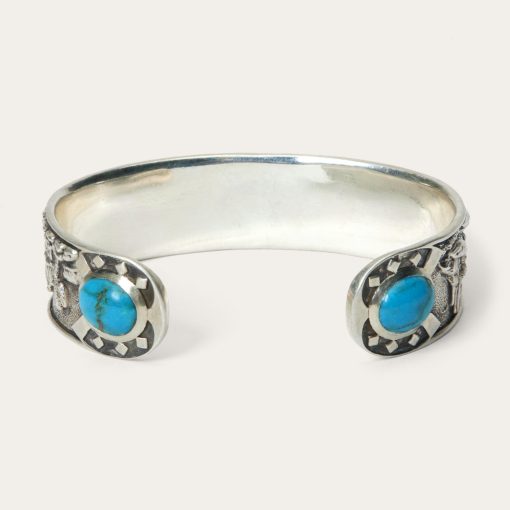 The rugged beauty and adventurous spirit of the American West is captured in this ornate sterling silver cuff, which presents a panoramic landscape inspired by Monument Valley. A lone cowboy rearing on his horse, hat held high, is depicted in celebration of the great surroundings. Striking Turquoise gemstones sit in horseshoe settings at either end of the cuff, bookending the sprawling, majestic image. Whether worn on its own, or layered with other accessories, it offers a timeless, Americana-inspired look.