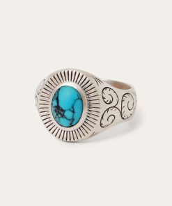 Filigree is an ancient art of hand engraving. This sterling silver ring features a classic filigree design, which snakes around the entire band and a stunning turquoise stone on its face.