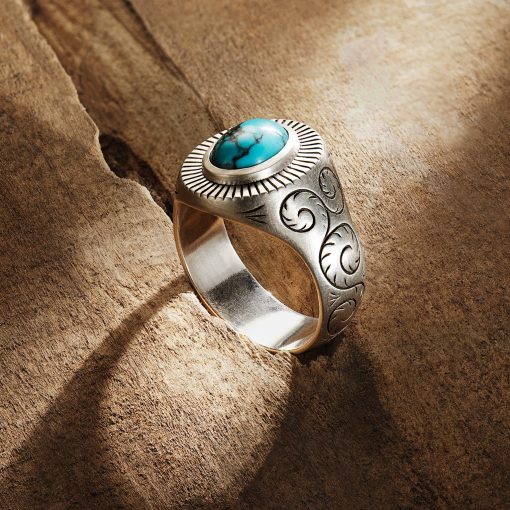 Filigree is an ancient art of hand engraving. This sterling silver ring features a classic filigree design, which snakes around the entire band and a stunning turquoise stone on its face.