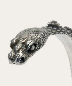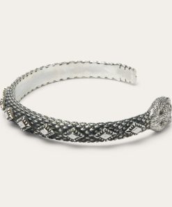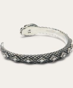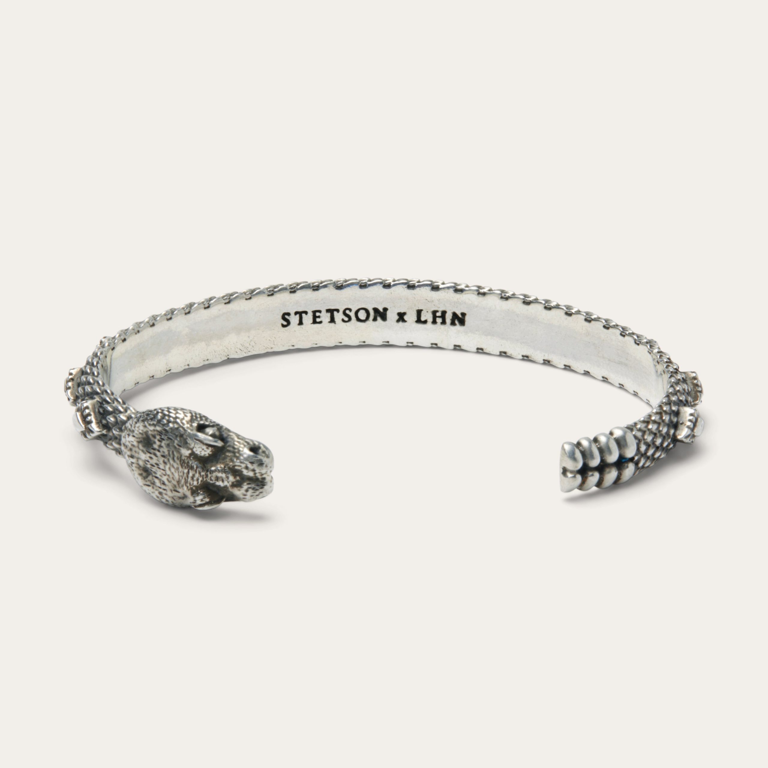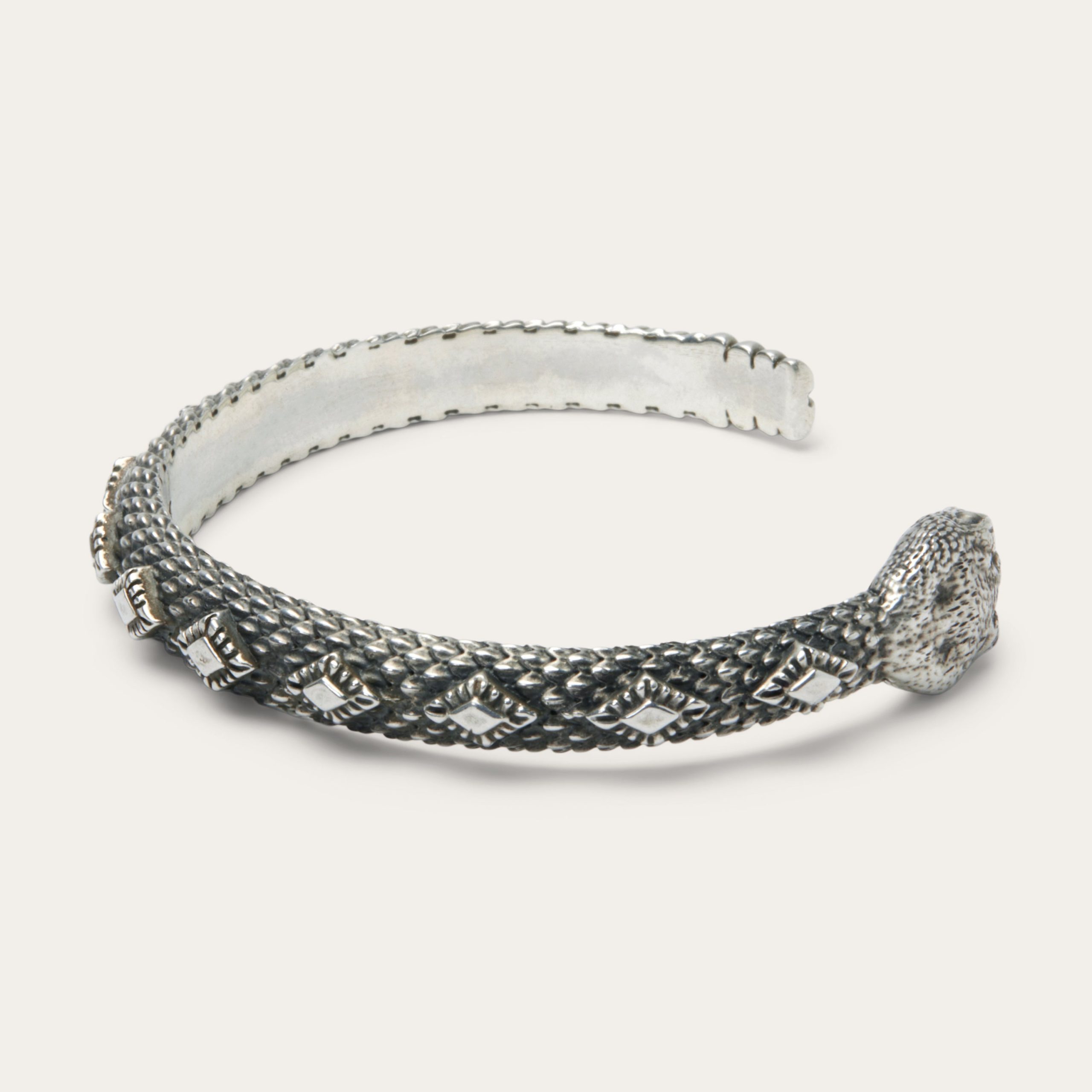 Rattlesnakes have always played an important part of the mythology of the Southwest. Although deadly, the rattlesnake was also thought to have healing properties and was considered a spirit animal. A diamond shaped pattern elevates the design of this sterling silver Rattlesnake Cuff. A perfect wrist accessory, the cuff can be worn on its own, or layered with other pieces for a timeless, Americana-inspired look.