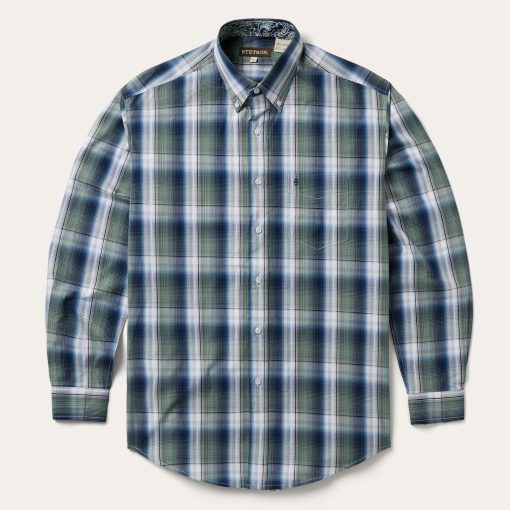 This button-up shirt is crafted from a yarn dyed Lucky Diamond plaid with dobby stitch. It features a straight back yoke with pleat, Stetson “S” logo embossed on the front left pocket, and “STETSON” embossed on the right sleeve placket. It has a contrast inside trim and a two-button adjustable mitered edge cuff. The classic button front is finished with pearl logo buttons and it is crafted with 100% cotton for quality and breathability. The feel of this shirt will only get better with age.