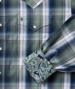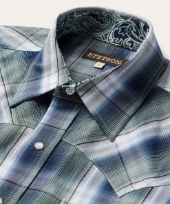 This Western shirt is crafted from a yarn dyed Lucky Diamond plaid with dobby stitch. It features a one-point ultra-deep curved back yoke, logo pearl snap front, and three snap cuffs. The front left pocket is adorned with the Stetson “S” logo and the right sleeve placket is embossed with “STETSON”. It has a contrast inside trim and is crafted with 100% cotton for quality, breathability and a soft feel that will only get better with age.