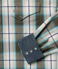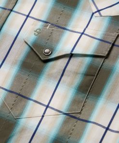 This snap front western shirt is crafted from 100% cotton and features a yarn-dyed olive ombre plaid with dobby stitch. It has asymmetrical snap-closure pockets with flaps, a spread collar,contrast denim inside trim and a one point back yoke.