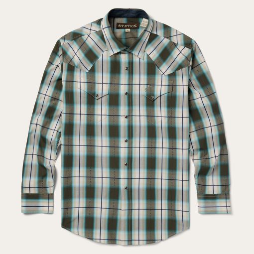 This snap front western shirt is crafted from 100% cotton and features a yarn-dyed olive ombre plaid with dobby stitch. It has asymmetrical snap-closure pockets with flaps, a spread collar,contrast denim inside trim and a one point back yoke.