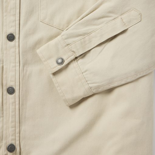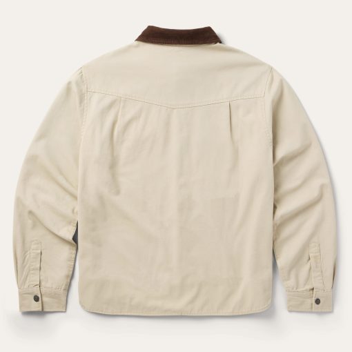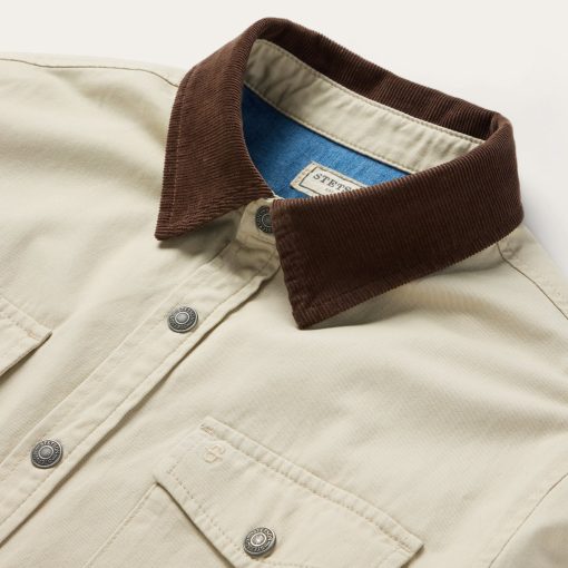This rugged, versatile shirt jacket is crafted from high-quality 100% cotton twill which has a sturdy and substantial feel. It features a contrast corduroy collar, full snap front and shirttail hem, along with a one-point shallow back yoke with pleats, one-point pockets & flaps, an inside patch pocket, side seam pockets and one-snap cuff.