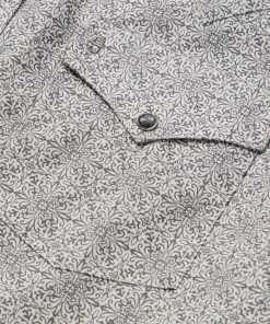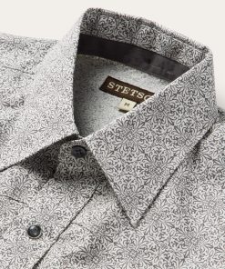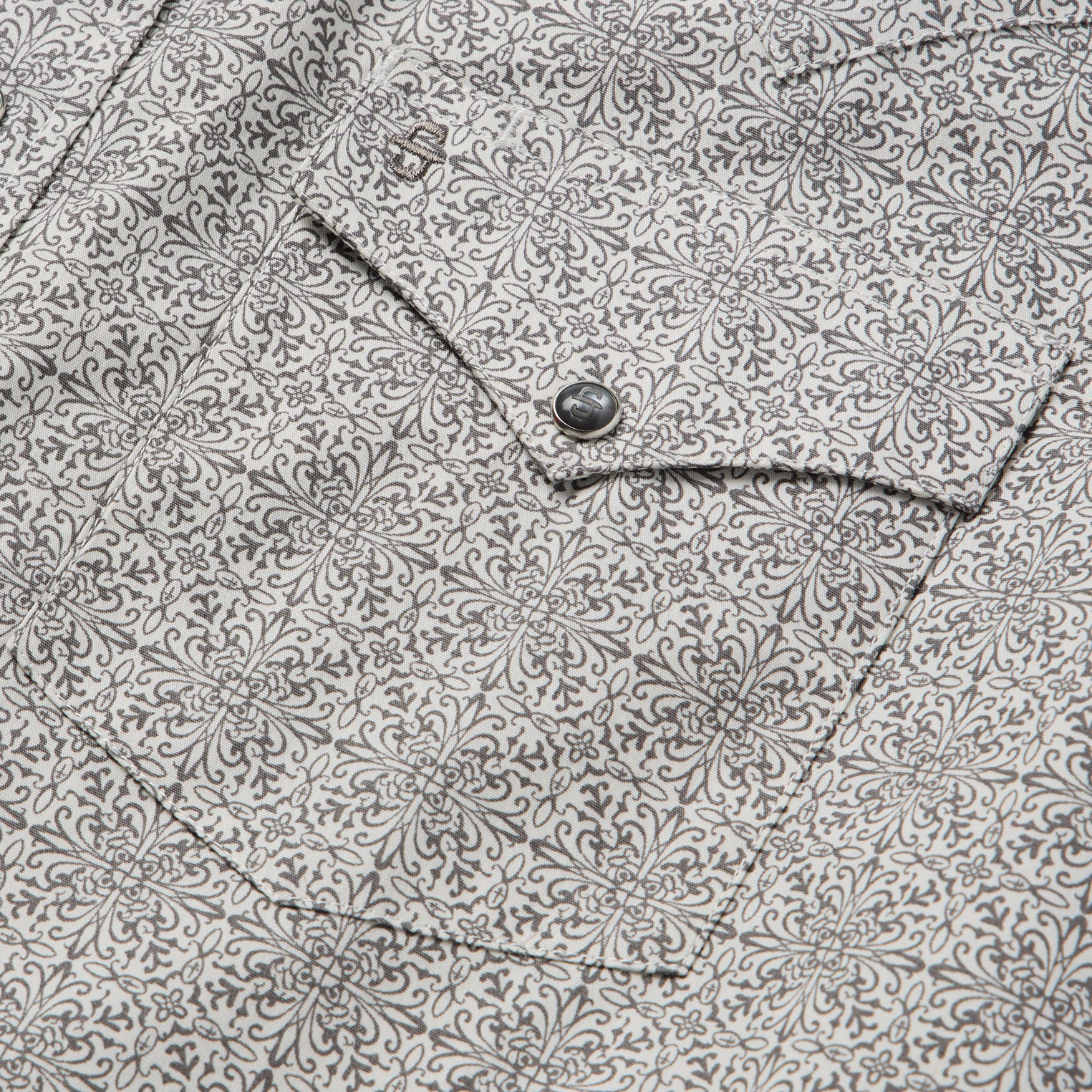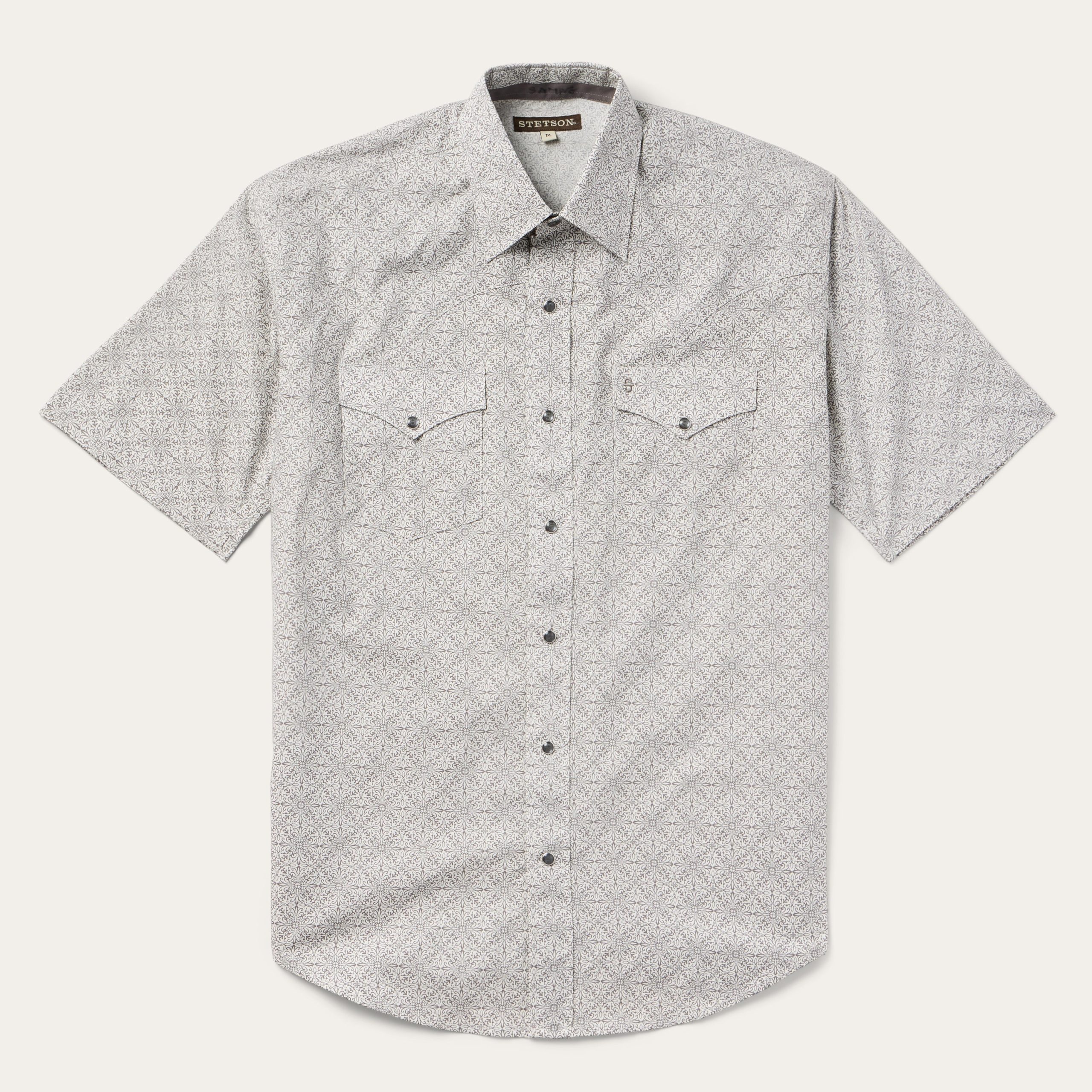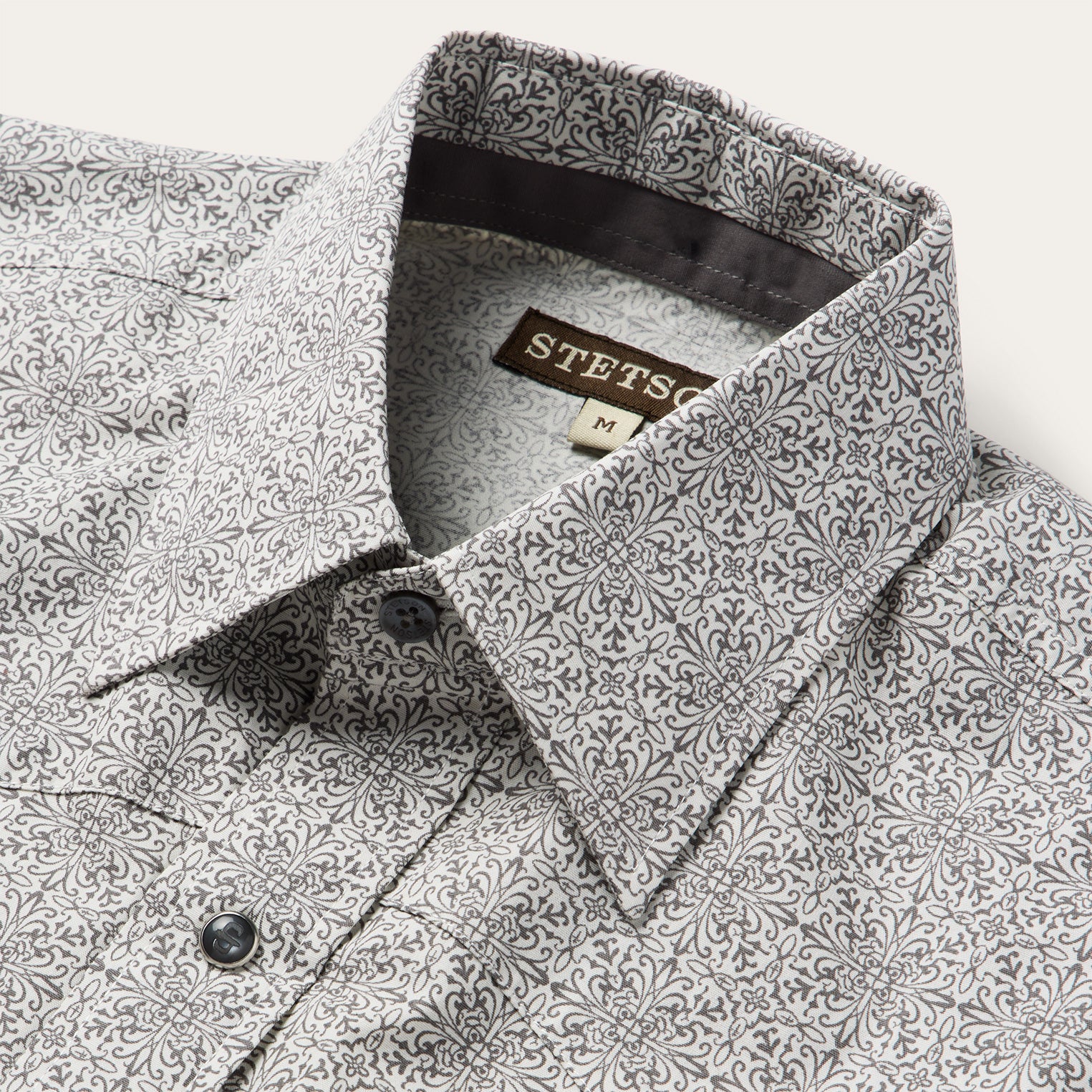 This short-sleeve western shirt crafted from high-quality 100% cotton poplin which has a crisp, cool feel and features our exclusive Pewter Filigree print. It has a one point curved front yoke, one point ultra deep curved back yoke, contrast inside trim, a classic snap and embroidered logo details.
