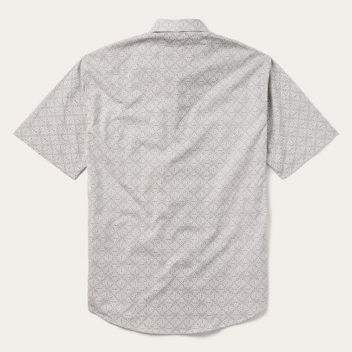 This short-sleeve western shirt crafted from high-quality 100% cotton poplin which has a crisp, cool feel and features our exclusive Pewter Filigree print. It has a one point curved front yoke, one point ultra deep curved back yoke, contrast inside trim, a classic snap and embroidered logo details.