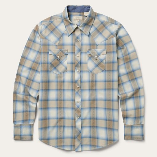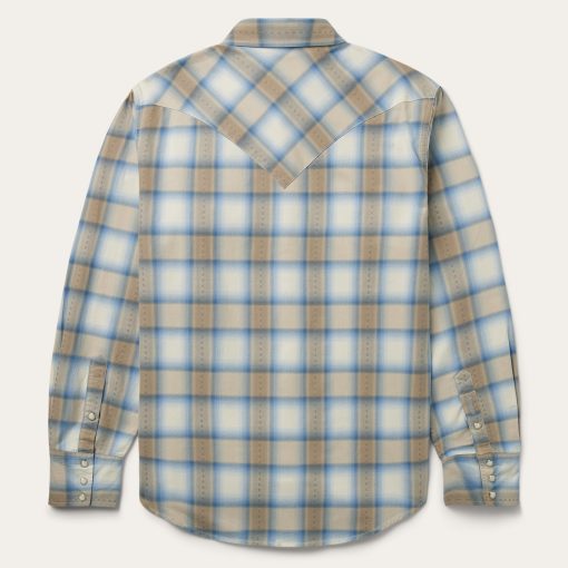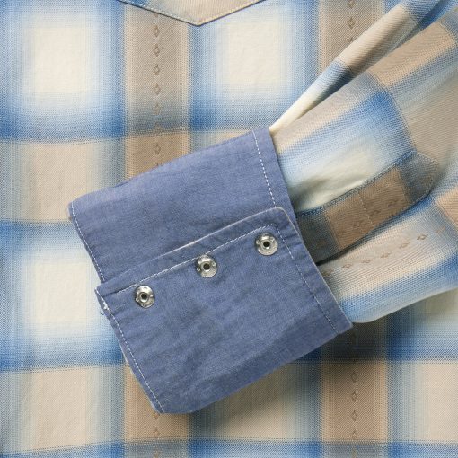 This western shirt is crafted from yarn dyed 100% cotton dobby and features an exclusive sand plaid with satin stitch. It has a one-point ultra-deep curved back yoke, logo pearl snap front, contrasting chambray inside trim, and three snap cuffs. The front left pocket is embroidered with the Stetson “S” logo and the right sleeve placket is embroidered with “STETSON.” Garment washed for softness, it has the feel of an old favorite that will only get better with time. Cut trim for a modern fit.