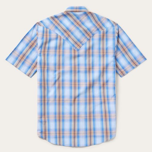 This short-sleeve western shirt is crafted from high-quality 100% cotton dobby and features an exclusive Sunrise plaid with satin stitch. It has a one point ultra-deep curved back yoke, classic snap front with pearl logo snaps, contrasting inside trim fabric, and an embroidered logo detail.