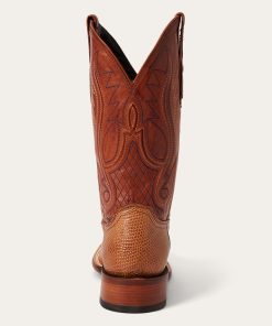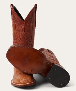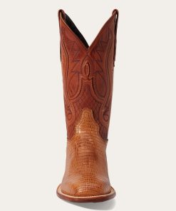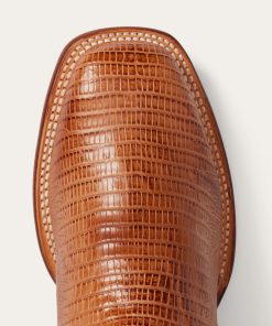 A square toe exotic that combines a working cowboy silhouette with luxury materials, the Arlington Teju Boot features a tan full Teju vamp and 13” cognac calf leather shaft with intricate hand stitching and cording. It has a square toe—a popular working style that provides maximum all-day comfort—and channel welted full leather construction with 56 lemonwood pegs and eight premium brass nails per boot. Premium leather lining, leather-lined Poron® insoles and a beveled bottom sole ensure heel-to-toe comfort in every step.