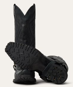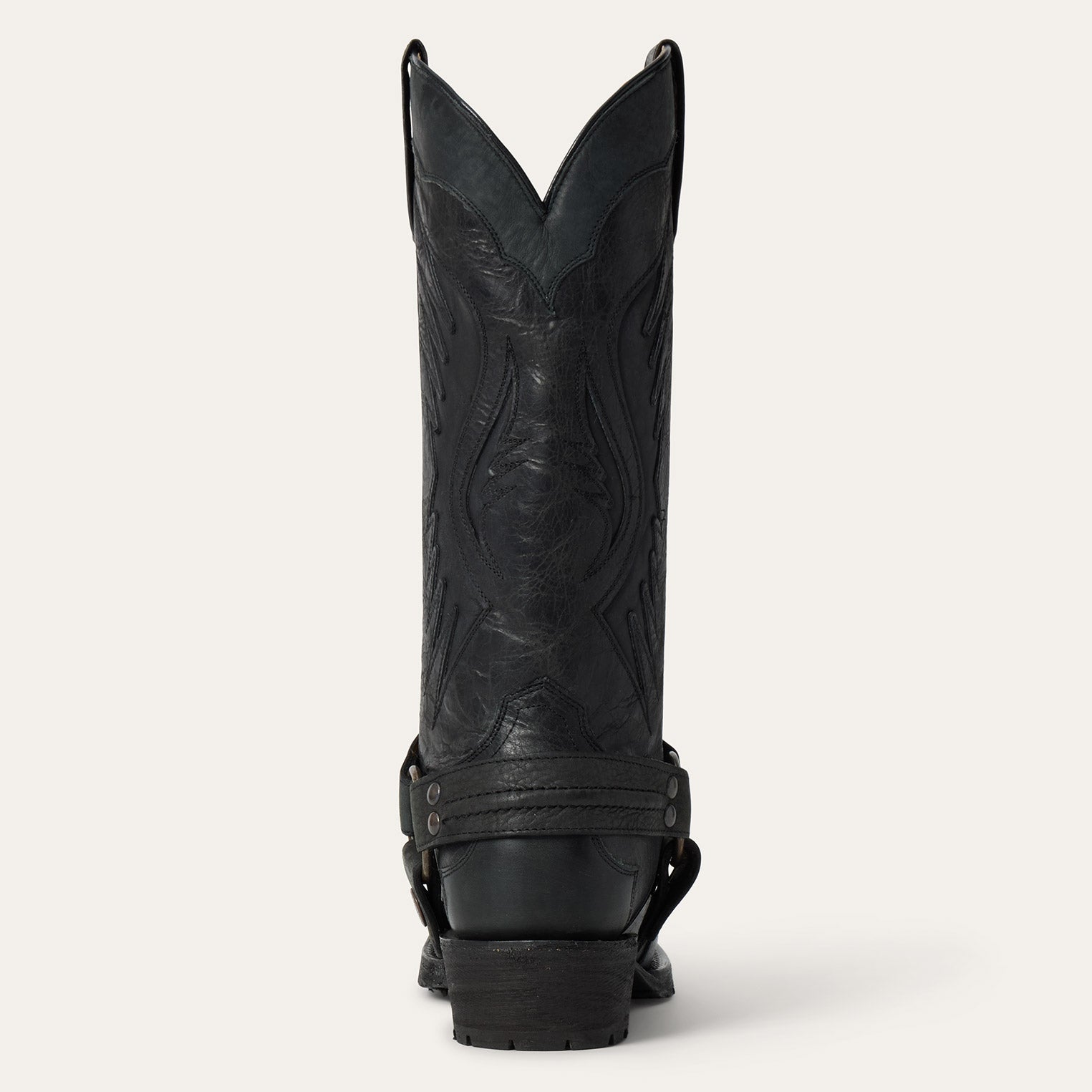 The rugged outlaw biker harness boot features a leather wingtip vamp and 13” leather wing shaft with intricate hand stitching. It has an outlaw toe—a rugged, modern style with a streamlined edge that splits the difference between square and snip toes—and a hand-stacked leather heel. The construction features a single welt and lug sole for added traction, along with a removable harness. Inside, a cushioned insole and premium cowhide leather lining provide lasting support and comfort.