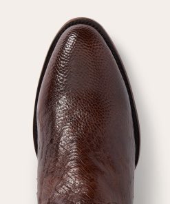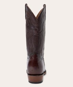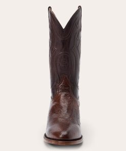 The Wyatt Ostrich Boot combines a traditional western silhouette with statement-making exotic materials. It features a genuine ostrich vamp and a 13” leather corded shaft and features an R toe—a classic all-purpose style that also dresses up well—as well as a stacked leather cowboy heel. Its quality construction includes 3⁄4 welt soles, brass nails and handmade lemonwood pegs that will expand and contract with any moisture the boot may encounter. Premium leather lining and a removable Tru-X insole ensure comfort in every step.