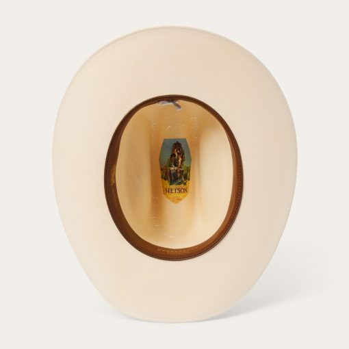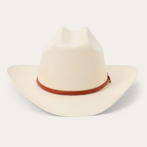 Handwoven one strand at a time in the U.S.A. from 10X quality shantung straw, the Primo Cognac combines our legendary craftsmanship with a timeless western profile, featuring a 4 ⅜” wide oval cattleman crown and 3 ½” slightly curved brim. It has a leather hatband with traditional three-piece silver-tone buckle set and a genuine leather sweatband for a secure, comfortable fit.