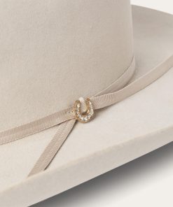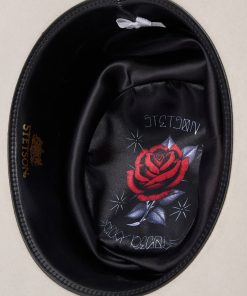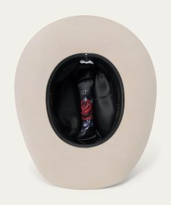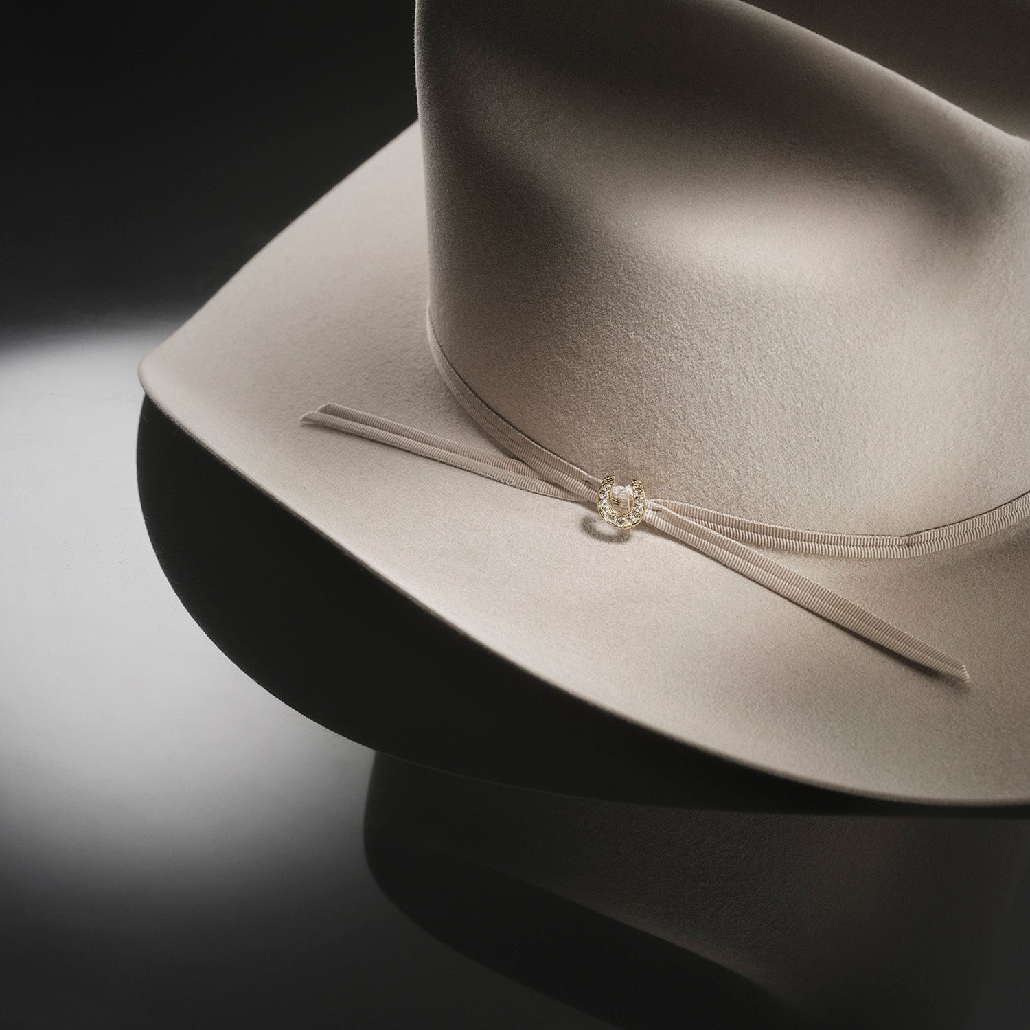 To create The Regal, Mars and the Stetson design team took a deep dive into the Stetson archive, finding inspiration in a bold silhouette that dates back to the 1870s. Called The Ranger, the original style features a 4 5/8″ cattleman crown and 3 1/2″ brim. Using this as a starting point, Mars added a 2-ply silk cord hatband, custom liner featuring a vintage-inspired rose motif, and gold-tone horseshoe pin with inlaid rhinestones.