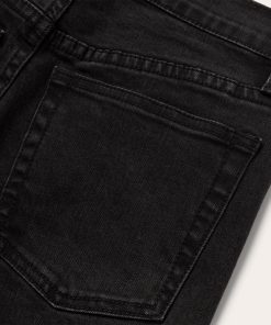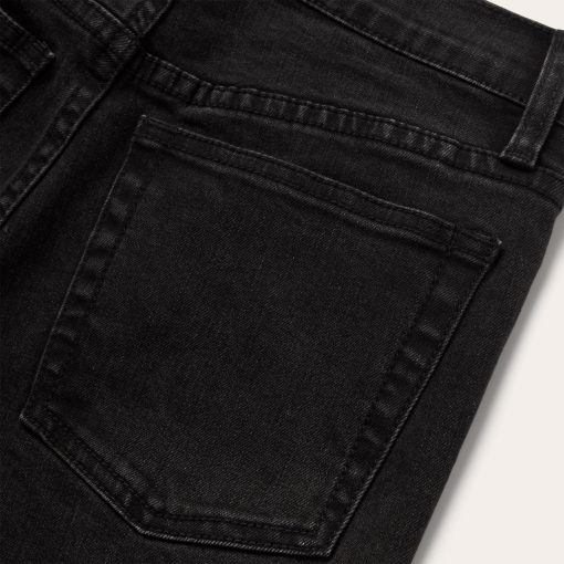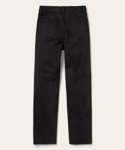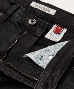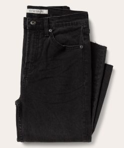 These black 915 High Rise Straight Fit Crop jeans are crafted from cotton denim with just enough stretch for comfort. They have a contour waistband that sits just below the waist, 5-pocket style, and a raw edge hem that is cropped to the ankle. The plain back pockets are finished with Stetson branded buttons, rivets, and zipper, and the jeans are finished with gentle sanding and whisker details for a lived-in look.