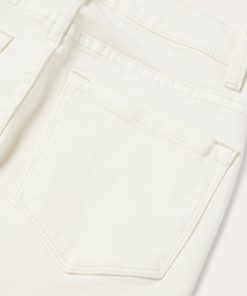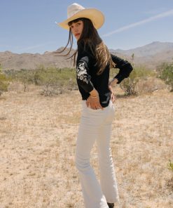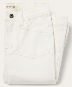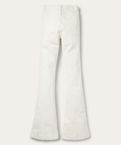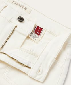 These high-rise, flare fit jeans are crafted from eggshell cream cotton denim with just enough stretch for comfort and ease of movement. Designed to sit at the natural waist, they have a slim fit through the thigh and knee that flares out into a stylish bootcut leg opening. The updated style features front patch pockets, plain back patch pockets and Stetson branded buttons, rivets, and zipper. Gentle hand-sanding and grinding details complete the jeans for a perfect lived-in look.