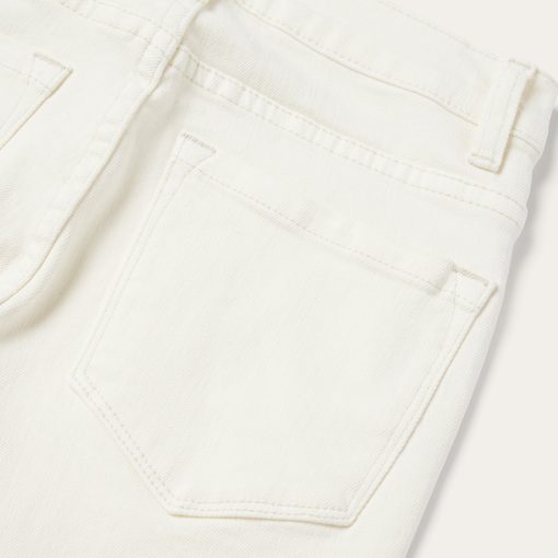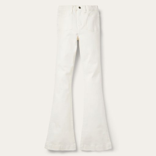 These high-rise, flare fit jeans are crafted from eggshell cream cotton denim with just enough stretch for comfort and ease of movement. Designed to sit at the natural waist, they have a slim fit through the thigh and knee that flares out into a stylish bootcut leg opening. The updated style features front patch pockets, plain back patch pockets and Stetson branded buttons, rivets, and zipper. Gentle hand-sanding and grinding details complete the jeans for a perfect lived-in look.