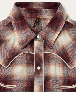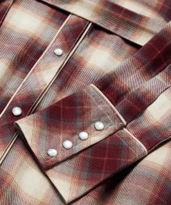 This Western-inspired shirt dress wears its influence well, with its stunning black cherry ombre plaid and other authentic style details. Crafted from 100% rayon twill that has a soft comfortable feel and a slinky drape, it has been yarn-dyed to retain its rich deep wine color. With a flattering fit that provides plenty of room to roam, it features a collar with full snap bias cut front packet, bias cut single point front and back yokes, four snap cuffs, a self-tie belt, A-line skirt and side seam pockets.