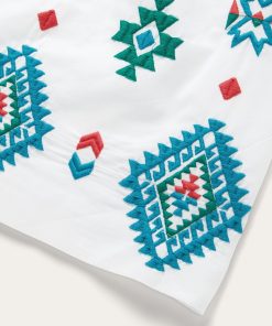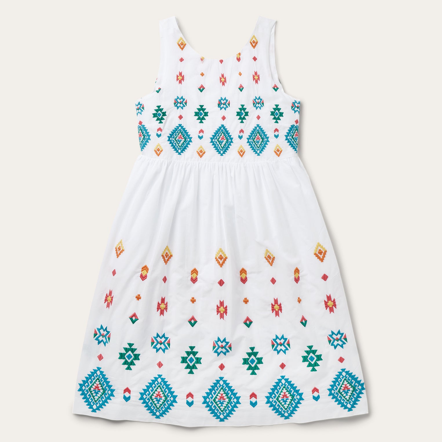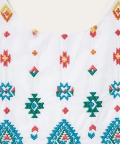 Colorful, lightweight and versatile, this white cotton lawn dress is embroidered with our vibrant red, yellow and turquoise Bright Schiffli design. It has an empire waist and large V back with a button strap closure. Darts at the bust provide a more custom-like fit, while the gathered skirt hits below the knees for a timeless silhouette. Made with smooth 100% high-quality white cotton lawn fabric, this lightweight, Western-inspired dress is ideal for any warm-weather gathering.