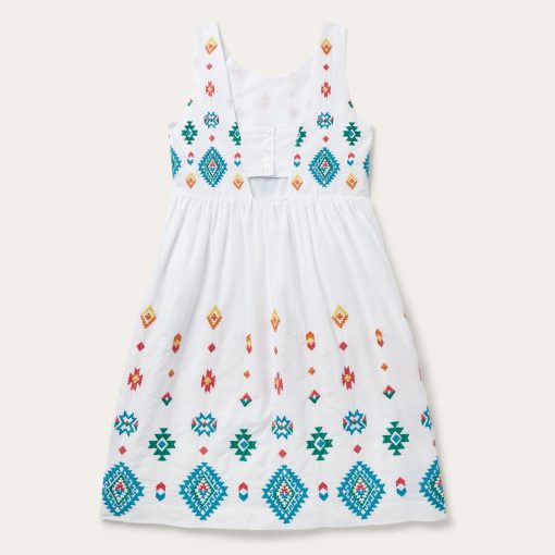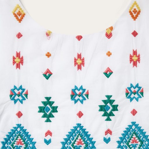 Colorful, lightweight and versatile, this white cotton lawn dress is embroidered with our vibrant red, yellow and turquoise Bright Schiffli design. It has an empire waist and large V back with a button strap closure. Darts at the bust provide a more custom-like fit, while the gathered skirt hits below the knees for a timeless silhouette. Made with smooth 100% high-quality white cotton lawn fabric, this lightweight, Western-inspired dress is ideal for any warm-weather gathering.