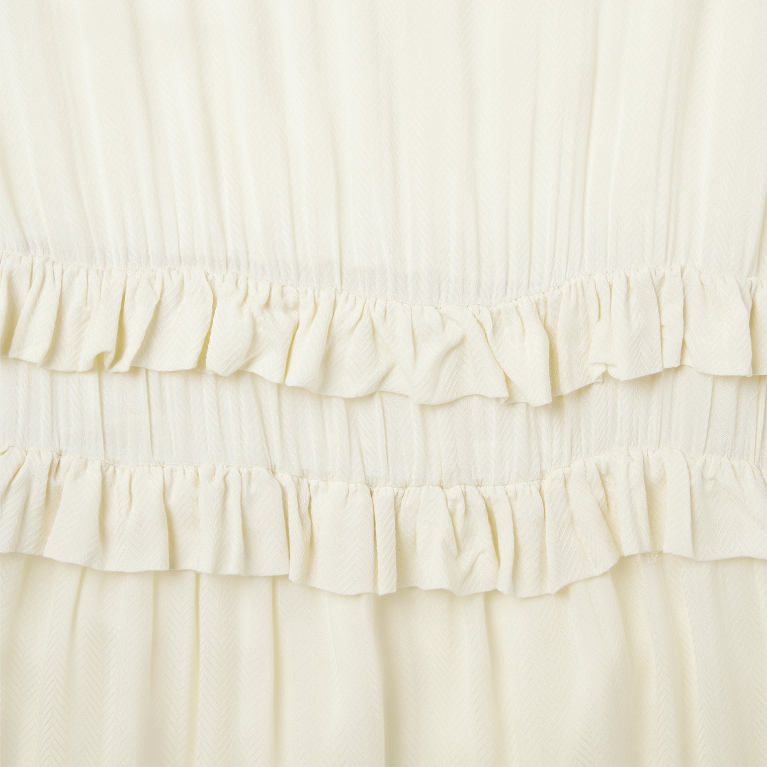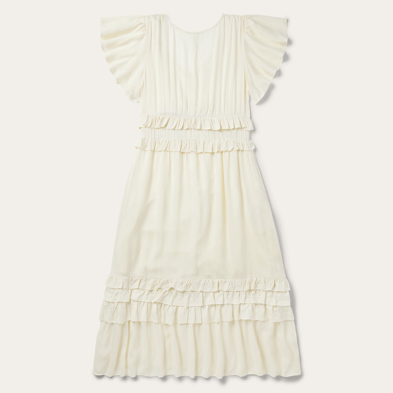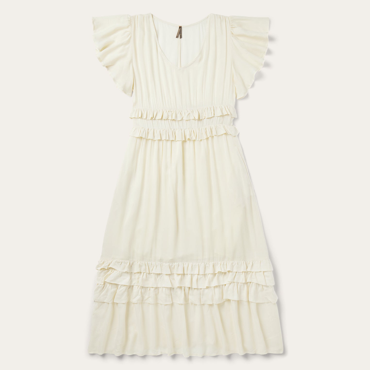 This cream herringbone dress is crafted from smooth, soft 100% rayon. Lightweight and breathable, its Western-inspired style features flutter ruffle short sleeves with gathers at the shoulders and sleeves, an elastic waist with two rows of ruffles, and three rows of tiered ruffles at the bottom of the skirt. Side seam pockets offer added convenience and the flattering, contemporary silhouette works both for daytime and evening occasions.