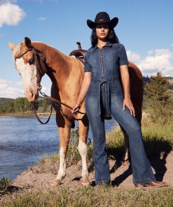 Ours is crafted from soft, durable cotton denim that has just enough stretch for all-day comfort and freedom of movement. Its stylish silhouette features flare bottoms with carpenter pockets, a short-sleeve zip-front bodice, fold-over collar, single point back yoke and belt loops with self tie belt.