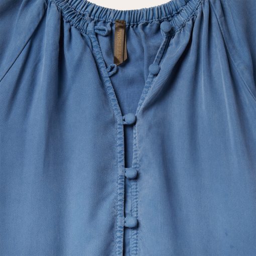 This Western-inspired dress is crafted from soft, durable 100% lyocell denim. It features flutter sleeves, an elastic neckline, and a full self-covered button bodice to the waist. The three tiered ruffle skirt provides a timeless, flowing silhouette, while the just below-the-knee length allows plenty of room for Western boots.