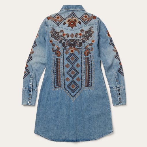 Stetson Women’s Dresses Floral Embroidered Denim Shirt Dress | Blue