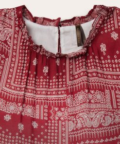 Crafted from soft, smooth 100% rayon, this women’s Western-style sleeveless dress features our eye-catching allover Red Bandana Patchwork print. It has a fitted bodice with bust darts and ruffled stand collar, along with a three-tier ruffle skirt that is accented by side seam pockets. Finished with a self-button back closure and invisible zipper, it has an easy and elegant silhouette that works both for both daytime and evening occasions.