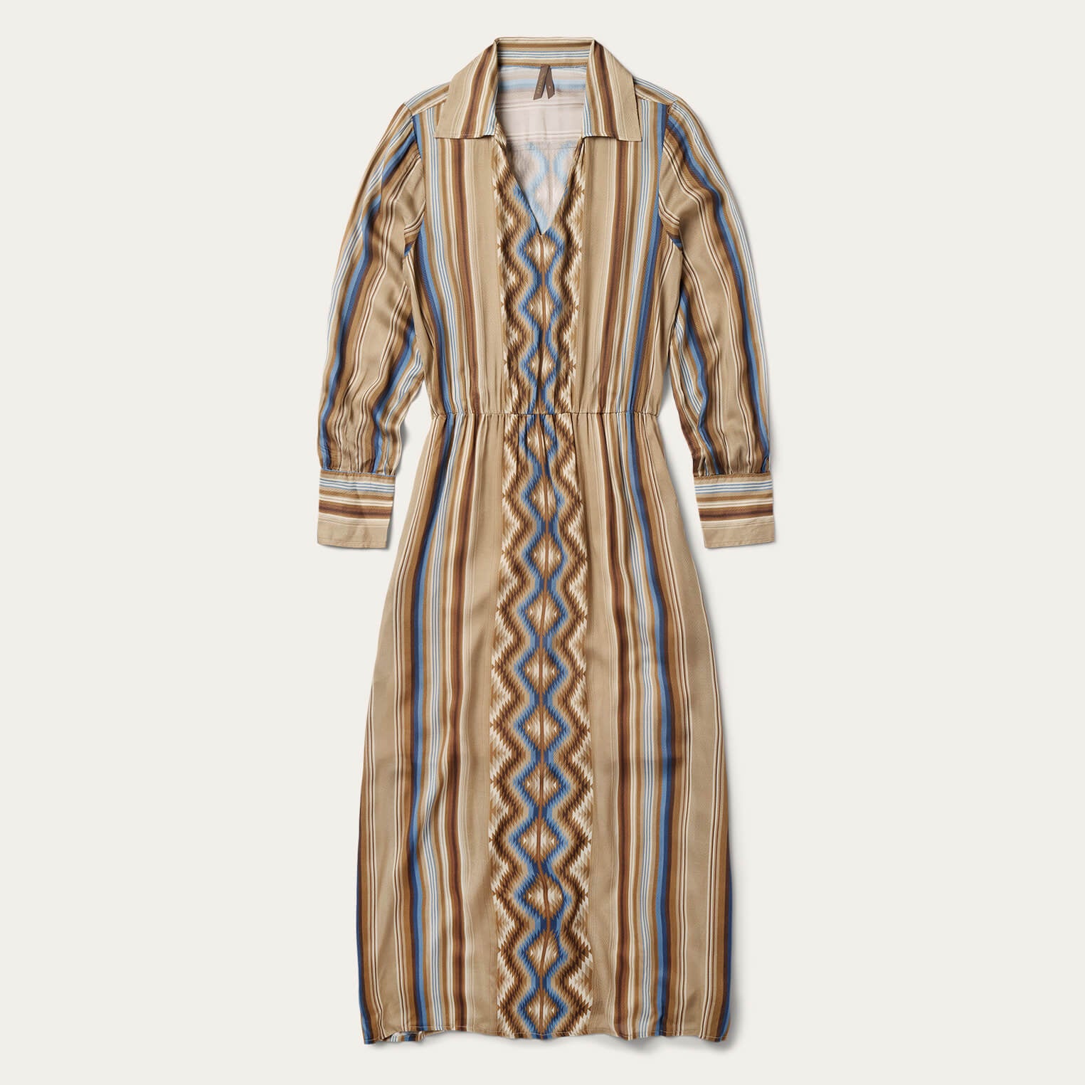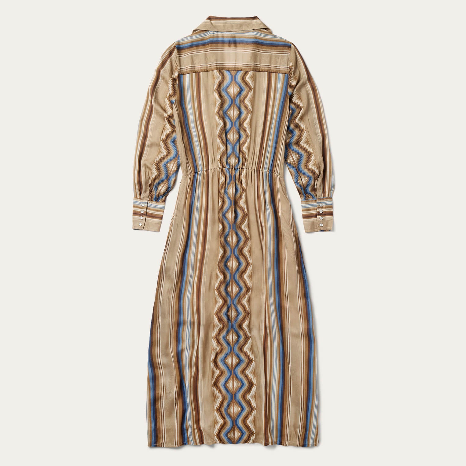 This stylish mid-length dress is crafted from 100% herringbone rayon, which has a smooth, silky feel and features our exclusive western-inspired Sand Serape print. It has a fold down collar with v-neckline, a straight back yoke, an elastic waist, partially-lined full skirt and deep, four-snap cuffs. Cut with an easy, flattering drape, the dress allows for all-day comfort and freedom of movement.