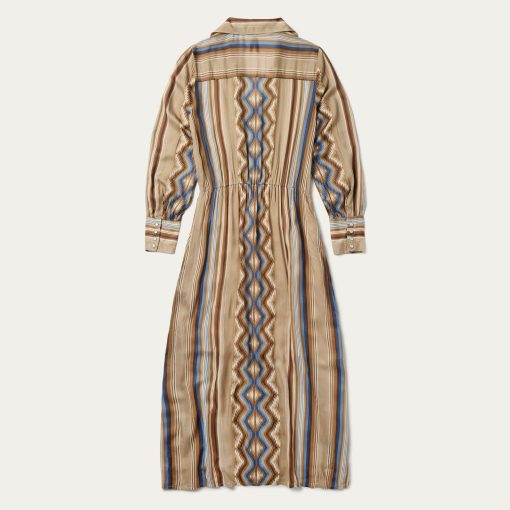 This stylish mid-length dress is crafted from 100% herringbone rayon, which has a smooth, silky feel and features our exclusive western-inspired Sand Serape print. It has a fold down collar with v-neckline, a straight back yoke, an elastic waist, partially-lined full skirt and deep, four-snap cuffs. Cut with an easy, flattering drape, the dress allows for all-day comfort and freedom of movement.