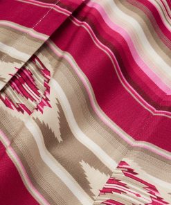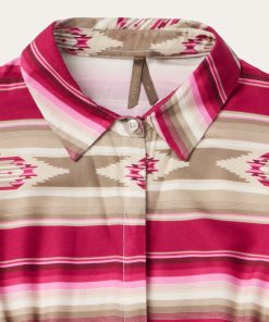 This vibrant mid-length dress is crafted from 100% rayon, which has a smooth, silky feel and features our exclusive western-inspired Scarlet Serape print. It has a fold down collar with full length hidden button placket closure, 3/4 length sleeves with gathers and button cuffs, and a fitted waistline with gathers and self fabric tie. Cut with an easy, flattering drape, the dress allows for all-day comfort and freedom of movement.