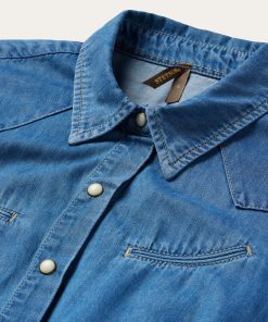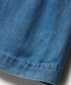 This stylish short-sleeve shirt dress is crafted from high-quality lyocell/linen denim and features western-style smile pockets. It has a collar, half front placket with snaps to the elastic waist, single point front and back yokes, self fabric tie belt and side seam pockets.