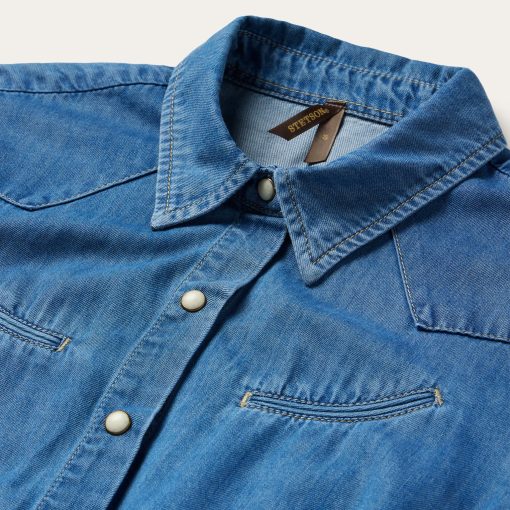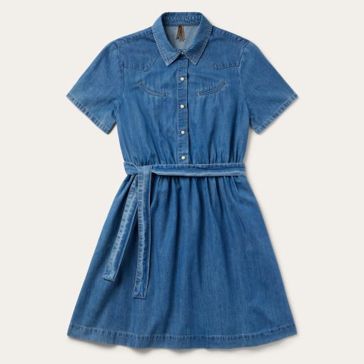 This stylish short-sleeve shirt dress is crafted from high-quality lyocell/linen denim and features western-style smile pockets. It has a collar, half front placket with snaps to the elastic waist, single point front and back yokes, self fabric tie belt and side seam pockets.