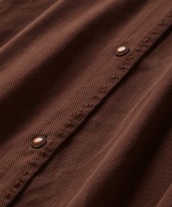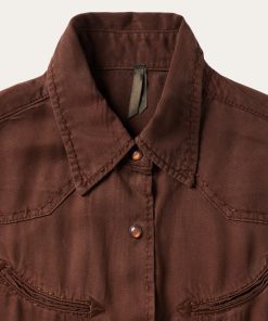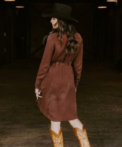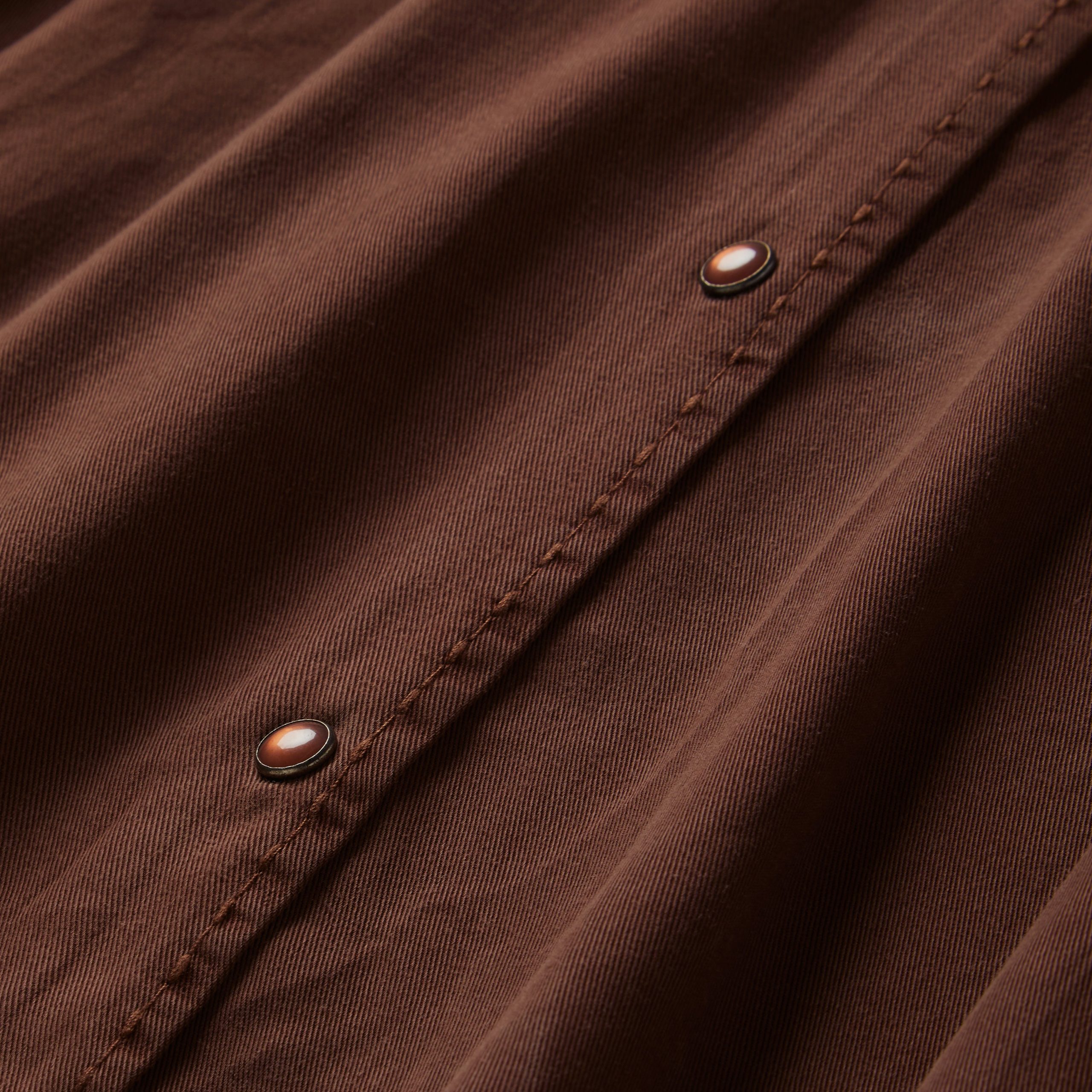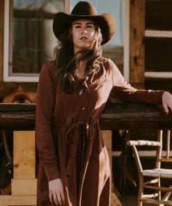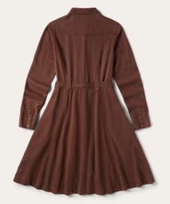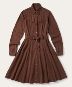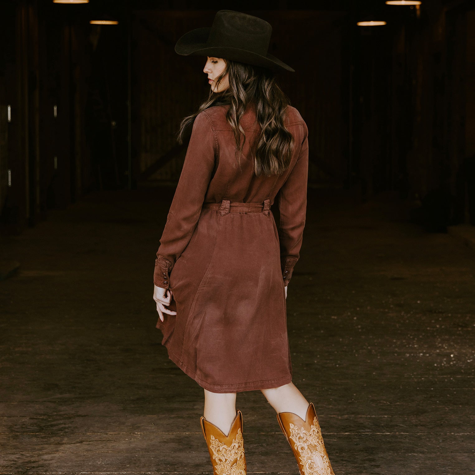With a rich tobacco color and authentic Western-inspired design, this long-sleeve, mid-length dress features one-point front and back yokes, a full-front snap placket, and curved snap cuffs. It has a self-tie belt with belt loops, two smile pockets and two two side seam pockets. Made from sustainable Tencel twill, it pairs equally well with a cowboy hat and boots as it does with a sun hat and sandals.