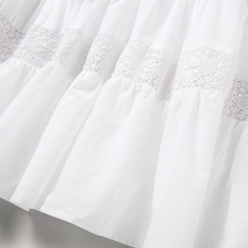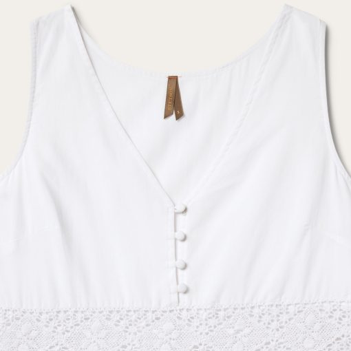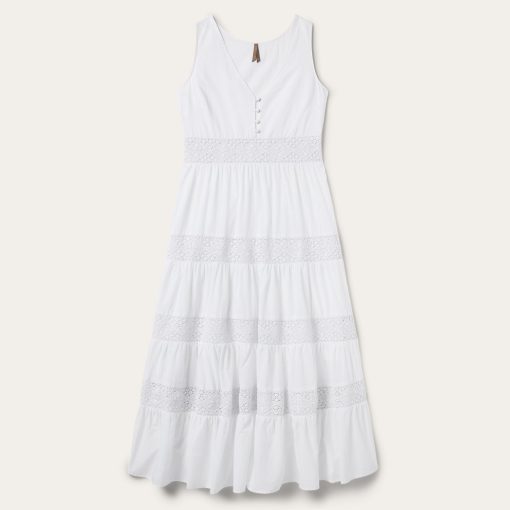 This white sleeveless calf-length dress is crafted from crisp, lightweight cotton lawn fabric. It has a v-neck with self covered button closure, lace insets and a gathered tiered skirt. Includes full bodice and partial skirt lining and an invisible side zipper. Cut with an easy, flattering drape, the dress allows for all-day comfort and freedom of movement.